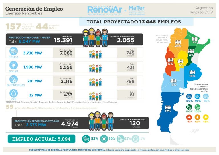 El desarrollo de la totalidad de los proyectos de generación de energías renovables ya adjudicados implicará la creación de 17.446 empleos hasta 2020, de los cuales 15.391 corresponden a la etapa de construcción y montaje de plantas, y 2.055 a los empleos para la operación y mantenimiento de las generadoras, de acuerdo con un informe elaborado por el Ministerio de Energía de la Nación.