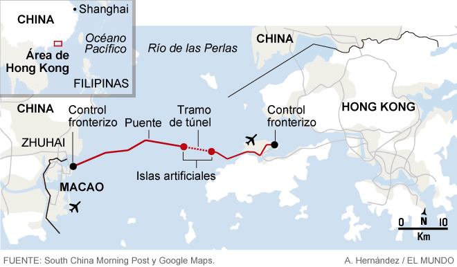 Como explicó el responsable de Transporte de Hong Kong, Frank Chan Fan, el pasado viernes en un encuentro con la prensa, el periplo entre esta población y el oeste de esta vasta zona agrupada en torno al delta del río Perla -el tercero más largo de la nación asiática- se reducirá a tres horas. “El viaje entre Zhuhai (una de las localidades continentales) y el aeropuerto de Hong Kong, que ahora lleva cuatro horas, se recortará a unos 45 minutos. De la misma forma, el viaje entre Zhuzai y la terminal de contenedores de Kwai Tsing (uno de los principales ejes del comercio de la antigua colonia inglesa) se reducirá de 3,5 horas a sólo 75 minutos“, explicó el representante local.