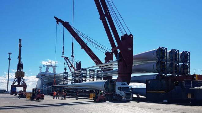 En la región la puesta en marcha de los seis proyectos adjudicados es una materia pendiente en la que en los últimos días se dieron los mayores avances con la llegada de los primeros molinos eólicos para el parque de Pomona, en Río Negro.